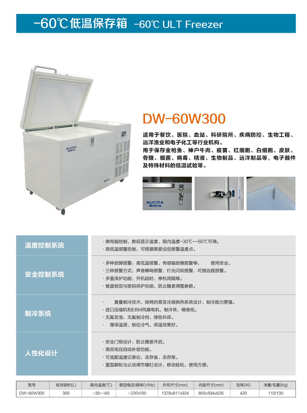澳柯瑪DW-60W300 300升-60度低溫冷柜 臥式超低溫冷凍冰箱產品介紹